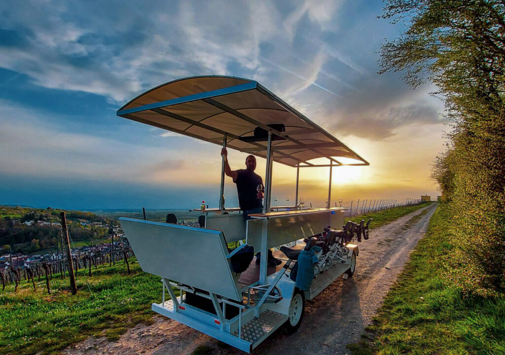 In Zusammenarbeit mit unserem Partner WeinVelo aus Weingarten bieten wir geführte Velo-Touren nach Absprache und für max. 7 Personen an. Erlebt das Kraichgauer Hügelland auf eine einmalige Art und Weise, indem ihr gemeinsam in das Pedalen tretet. Erlebt dieses unverwechselbare Event in einmaliger, geselliger Atmosphäre und erlebt einen unterwechselbaren Tag.